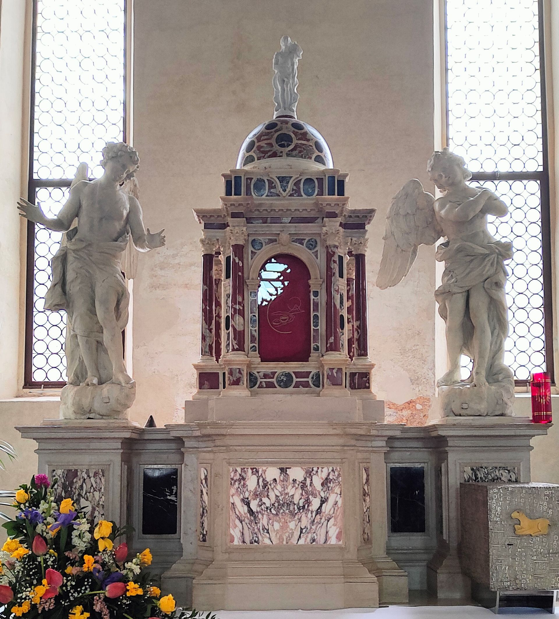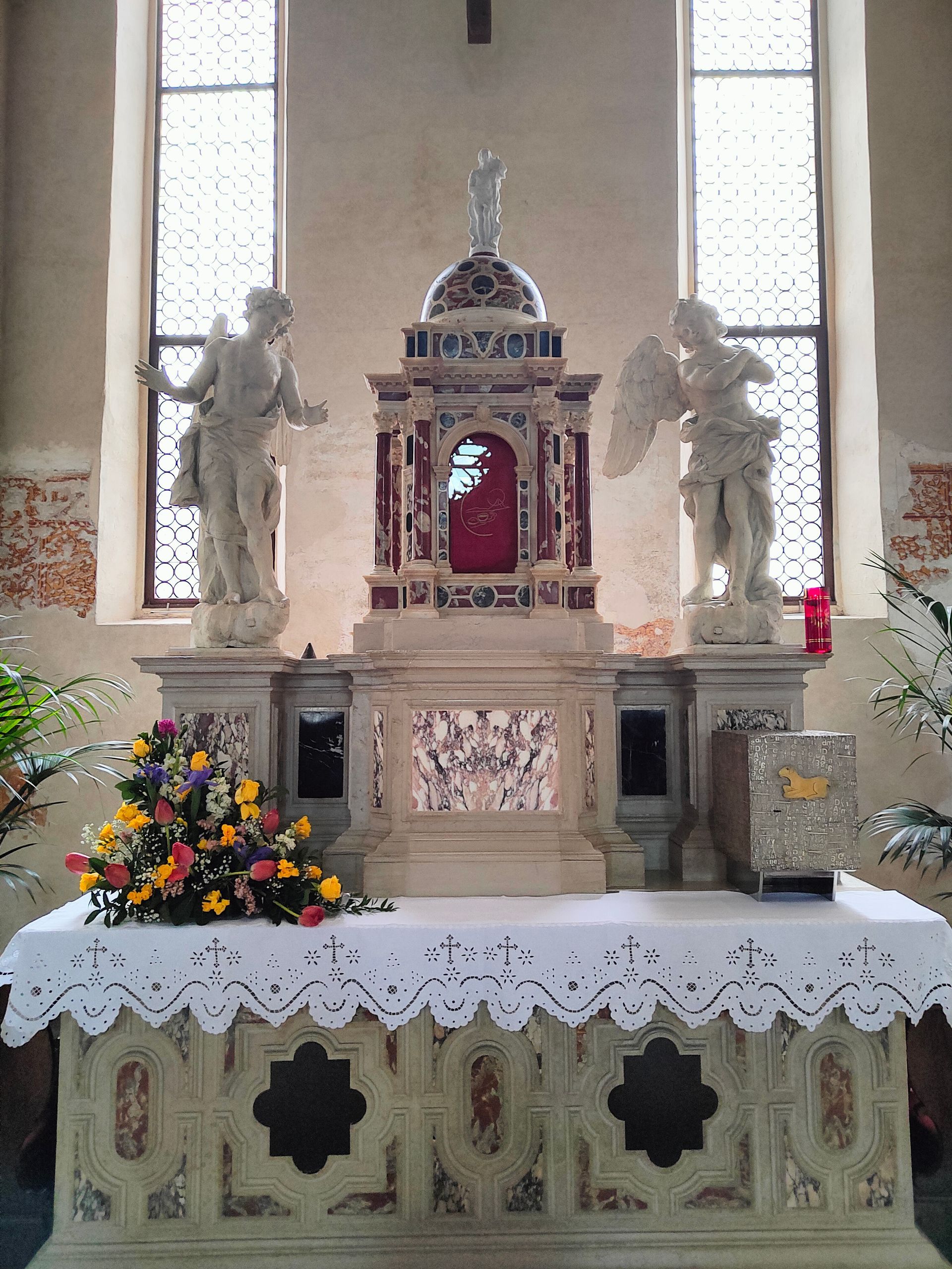 L'altare maggiore è della seconda metà del 1600. Riproduce l'architettura di un tempietto nel cui tabernacolo si custodisce, dal 1793, la Sacra Tovaglia. Ai lati trovano posto due statue lignee di Angeli Adoranti. Il tabernacolo d'argento per la custodia dell'Eucarestia è di Giorgio Celiberti (2005).