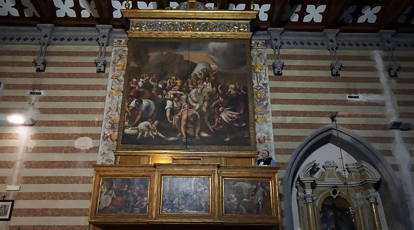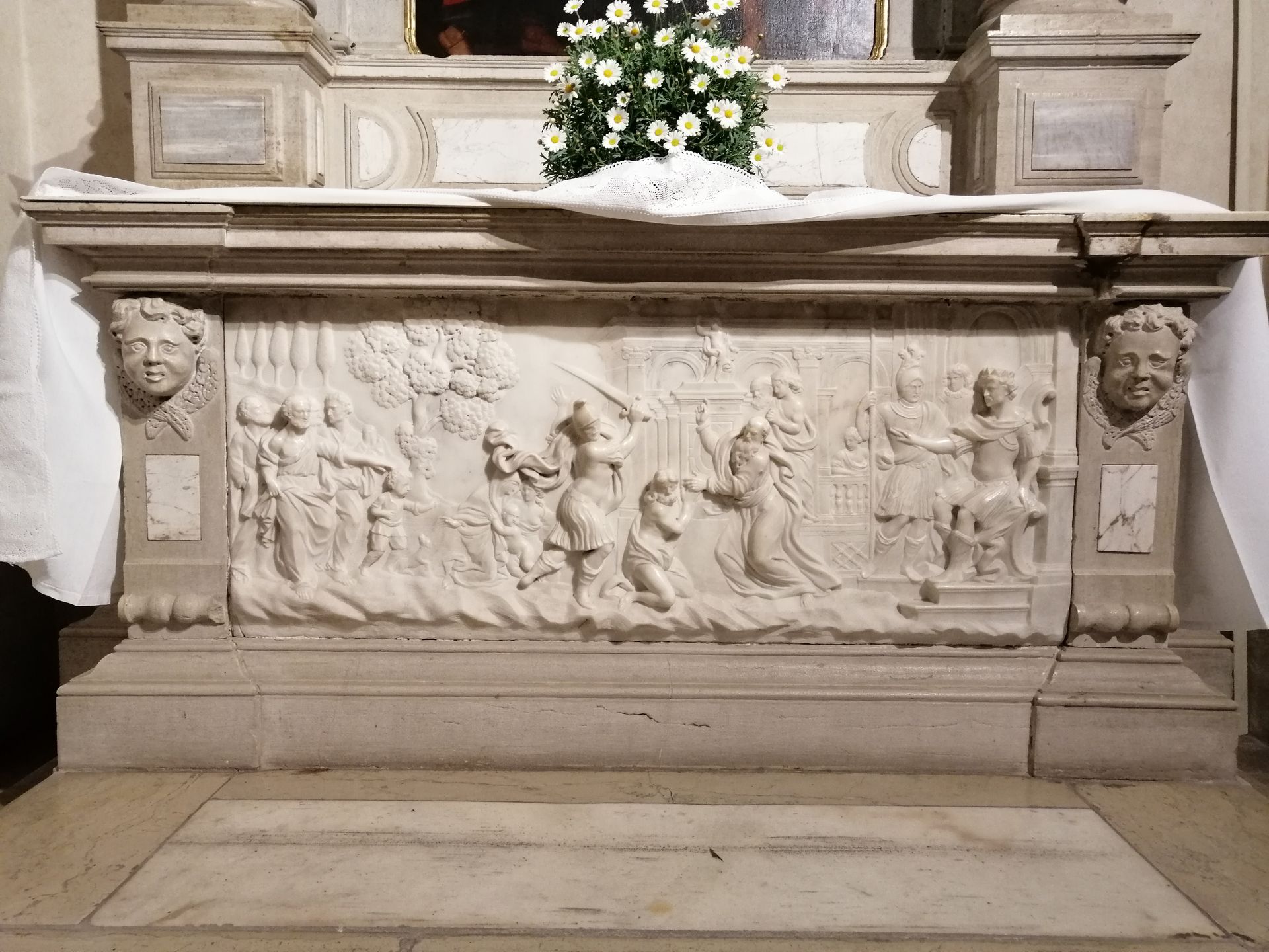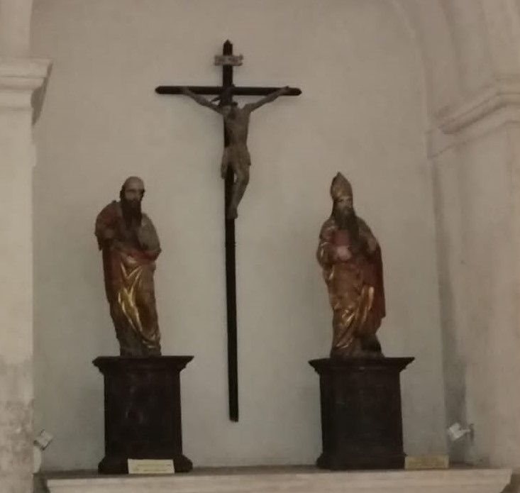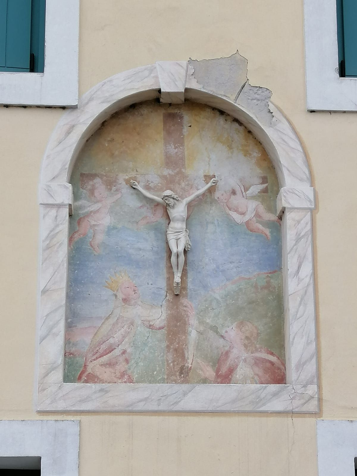 Il Crocifisso è un'importante opera d'intaglio che pur richiamando modelli artistici del 1400, viene attribuito a Pomponio Amalteo (1556).