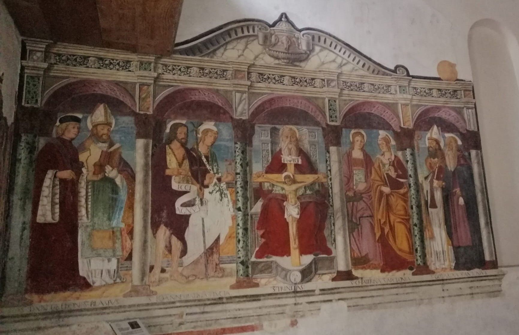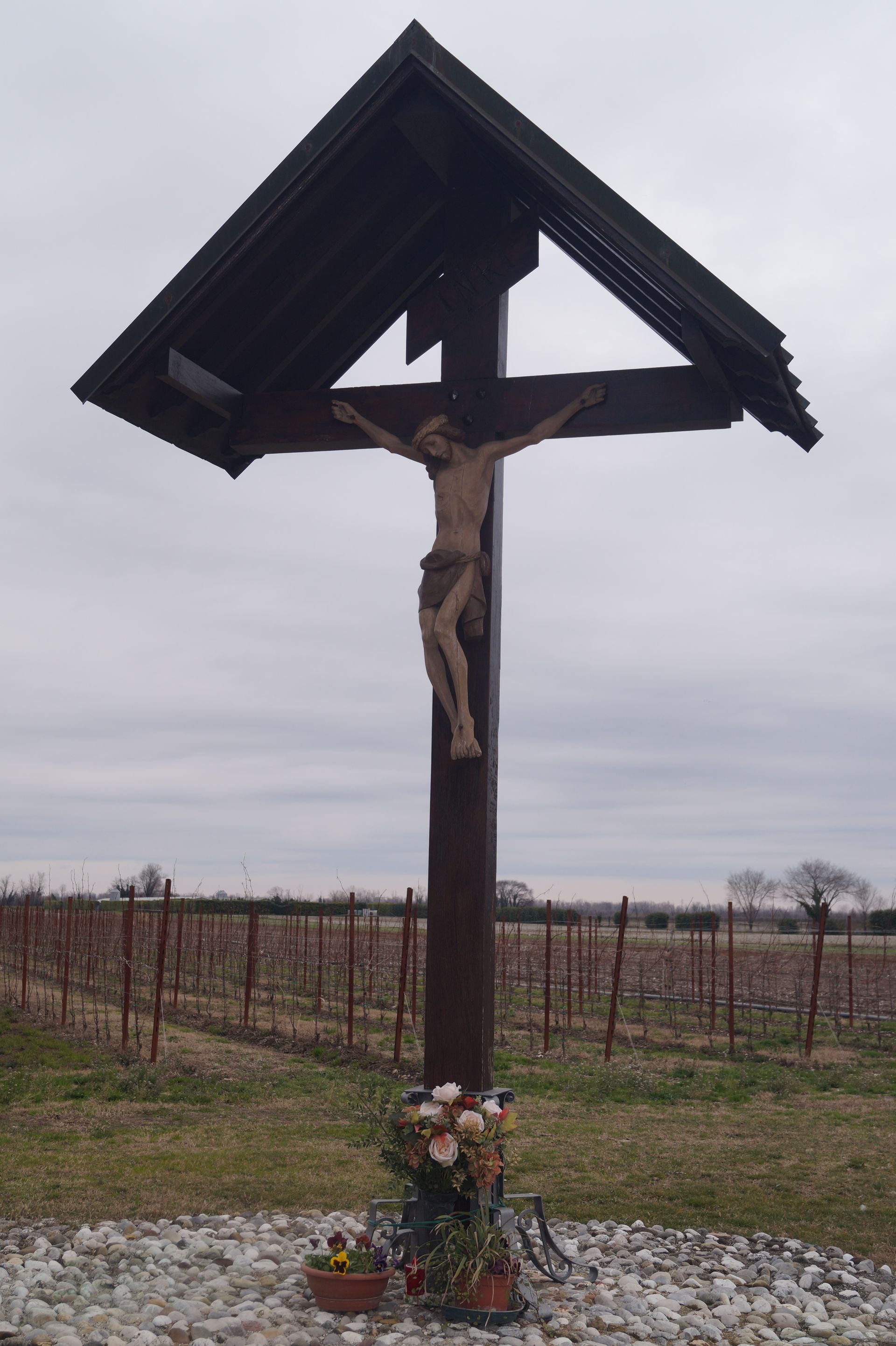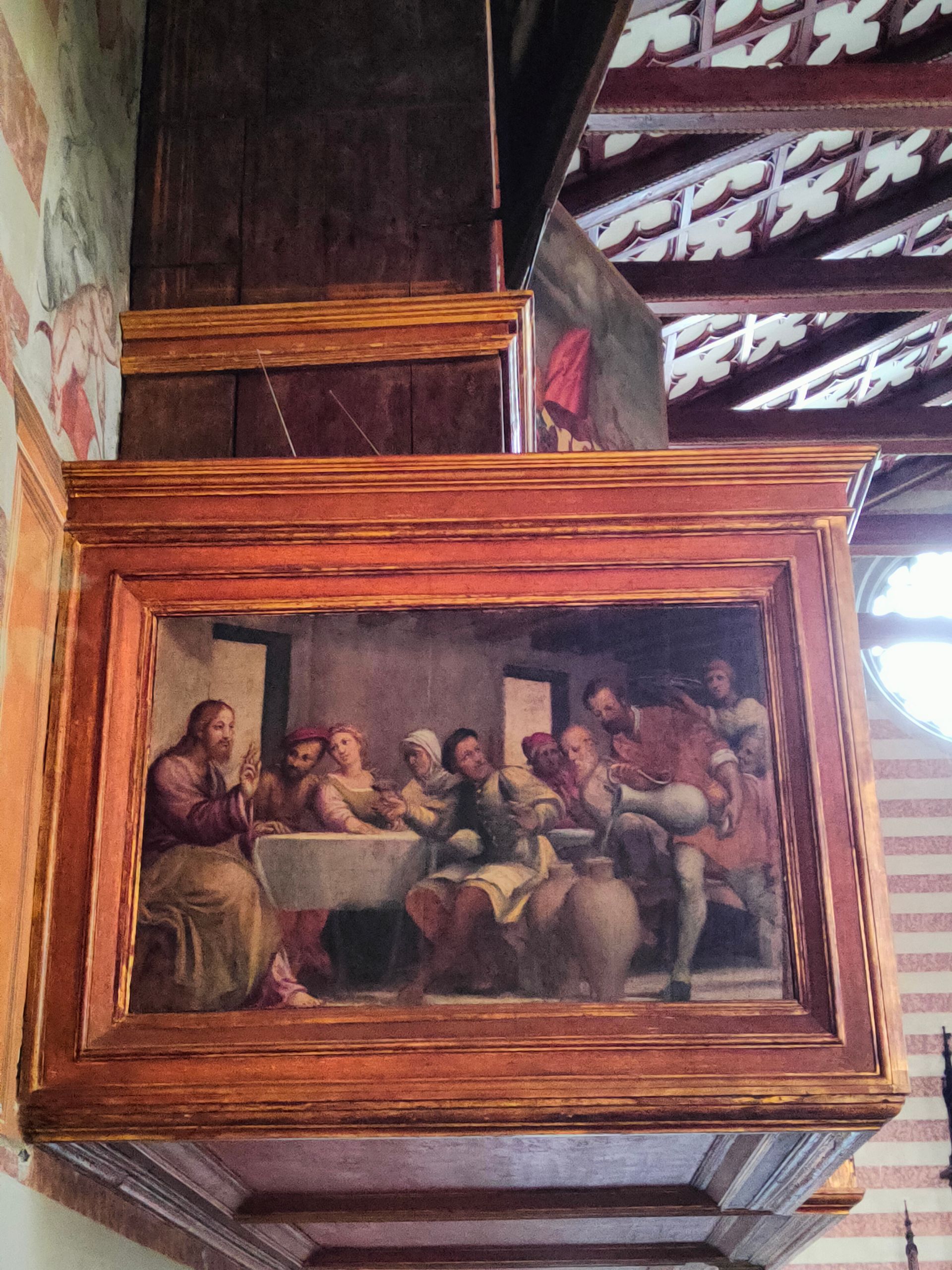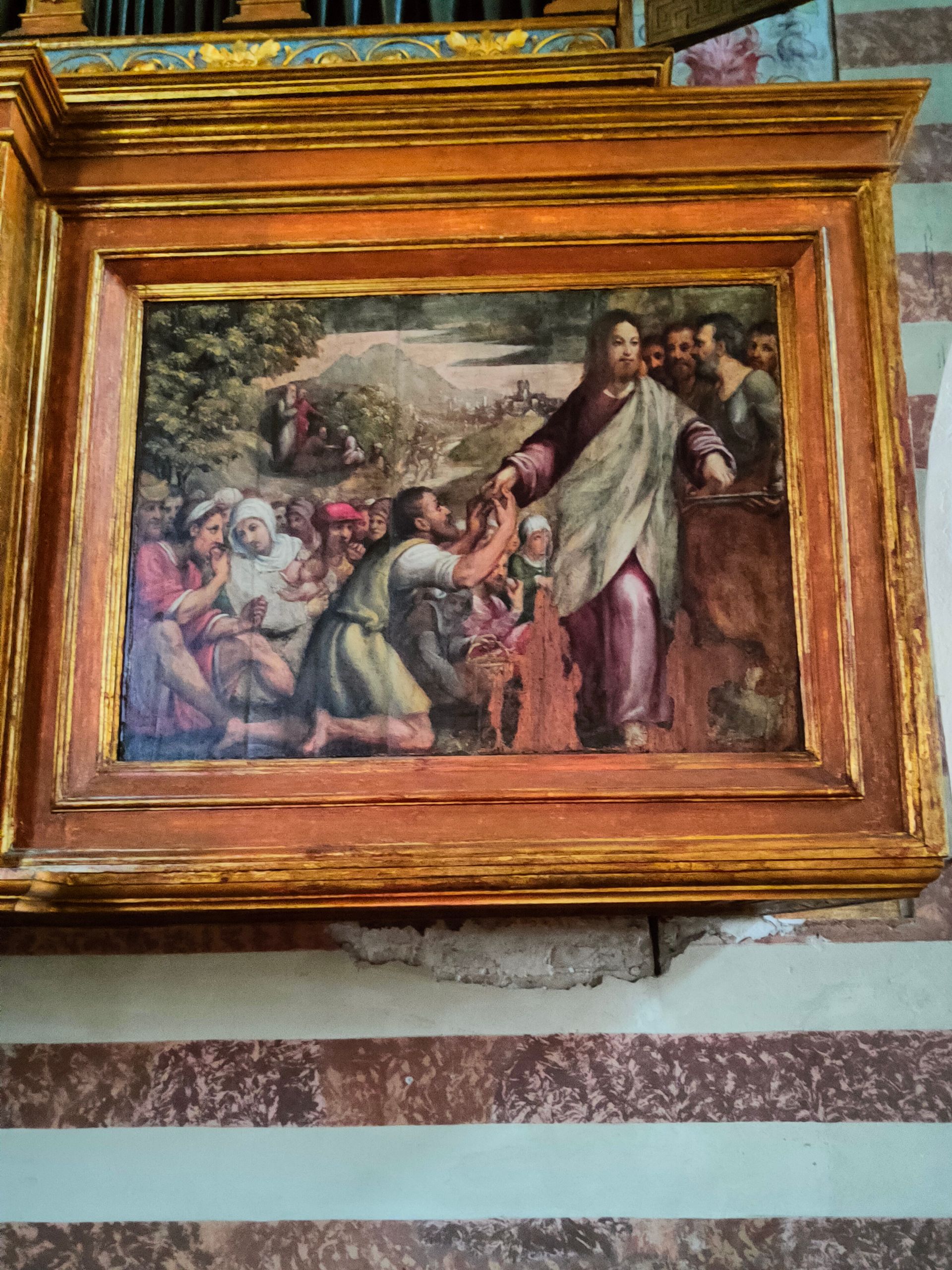 Il Crocifisso è un'importante opera d'intaglio che pur richiamando modelli artistici del 1400, viene attribuito a Pomponio Amalteo (1556).