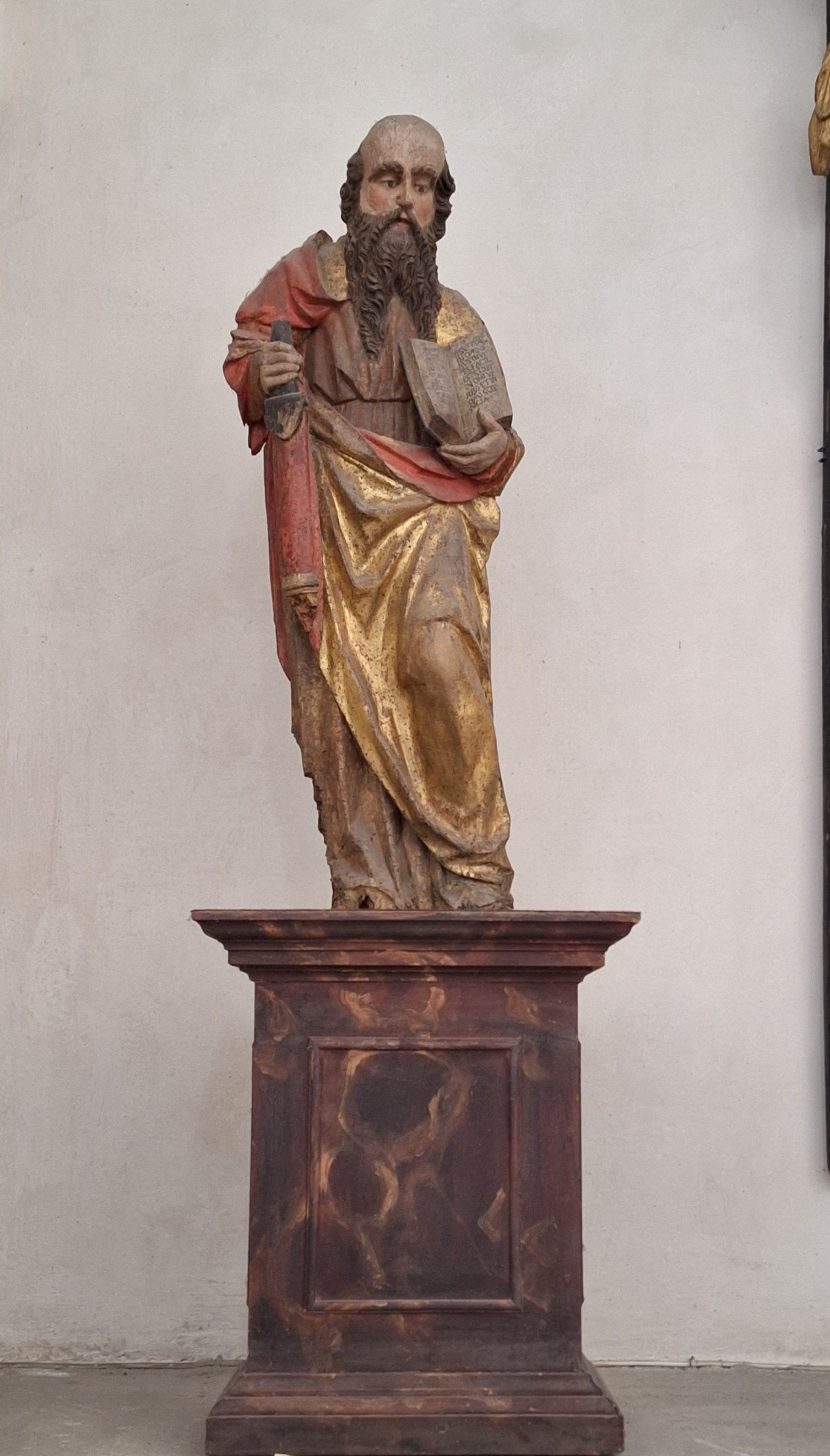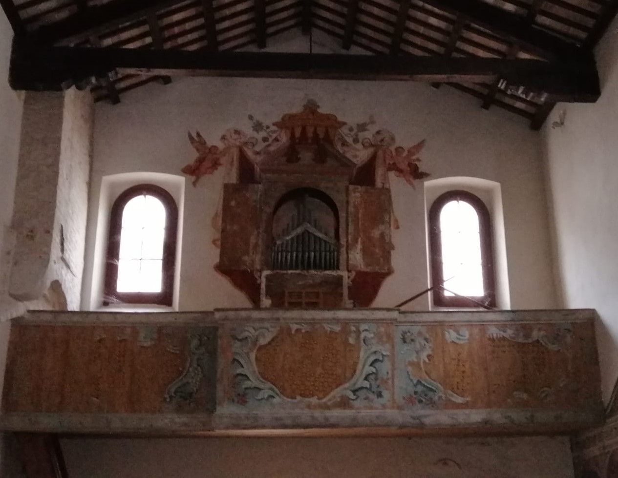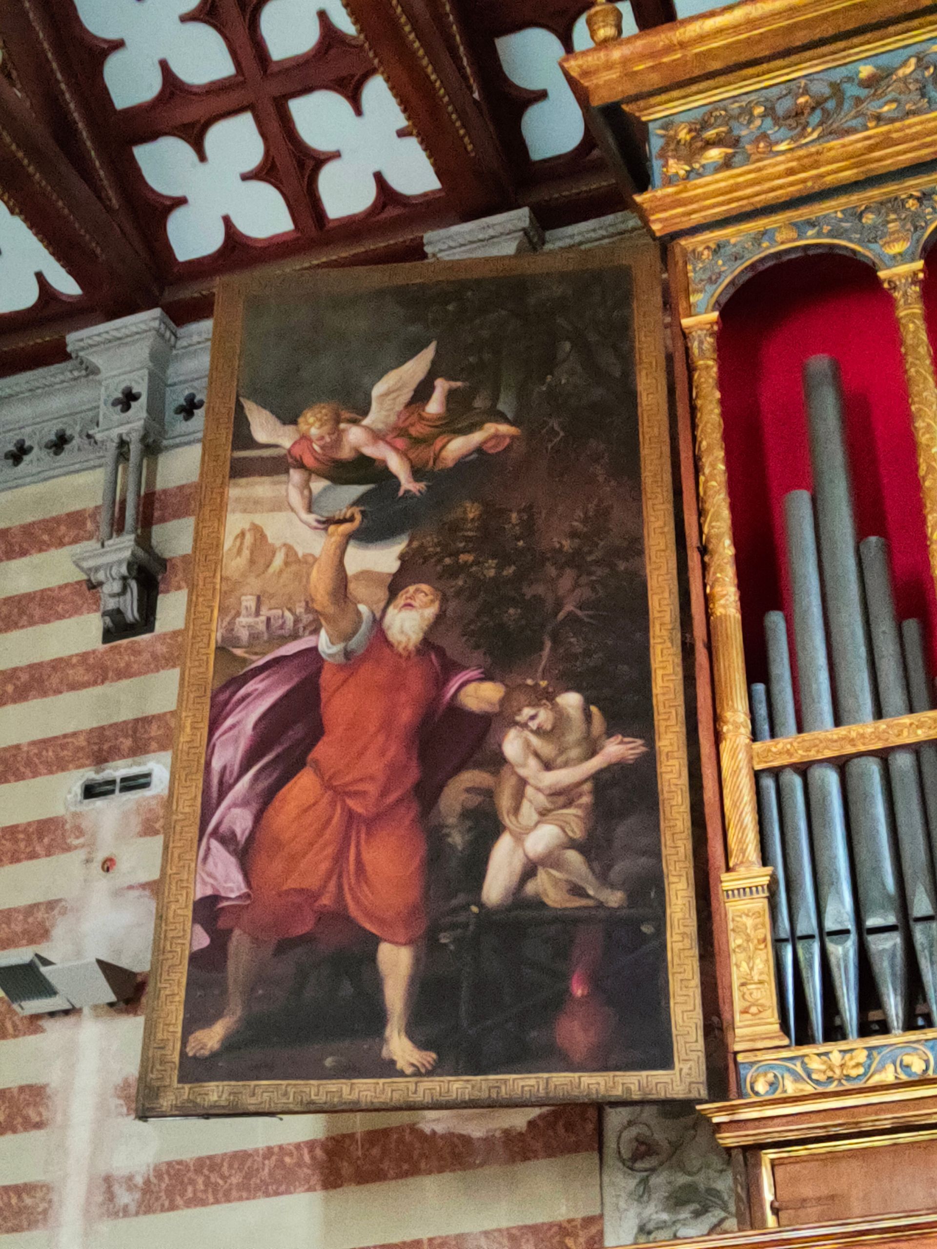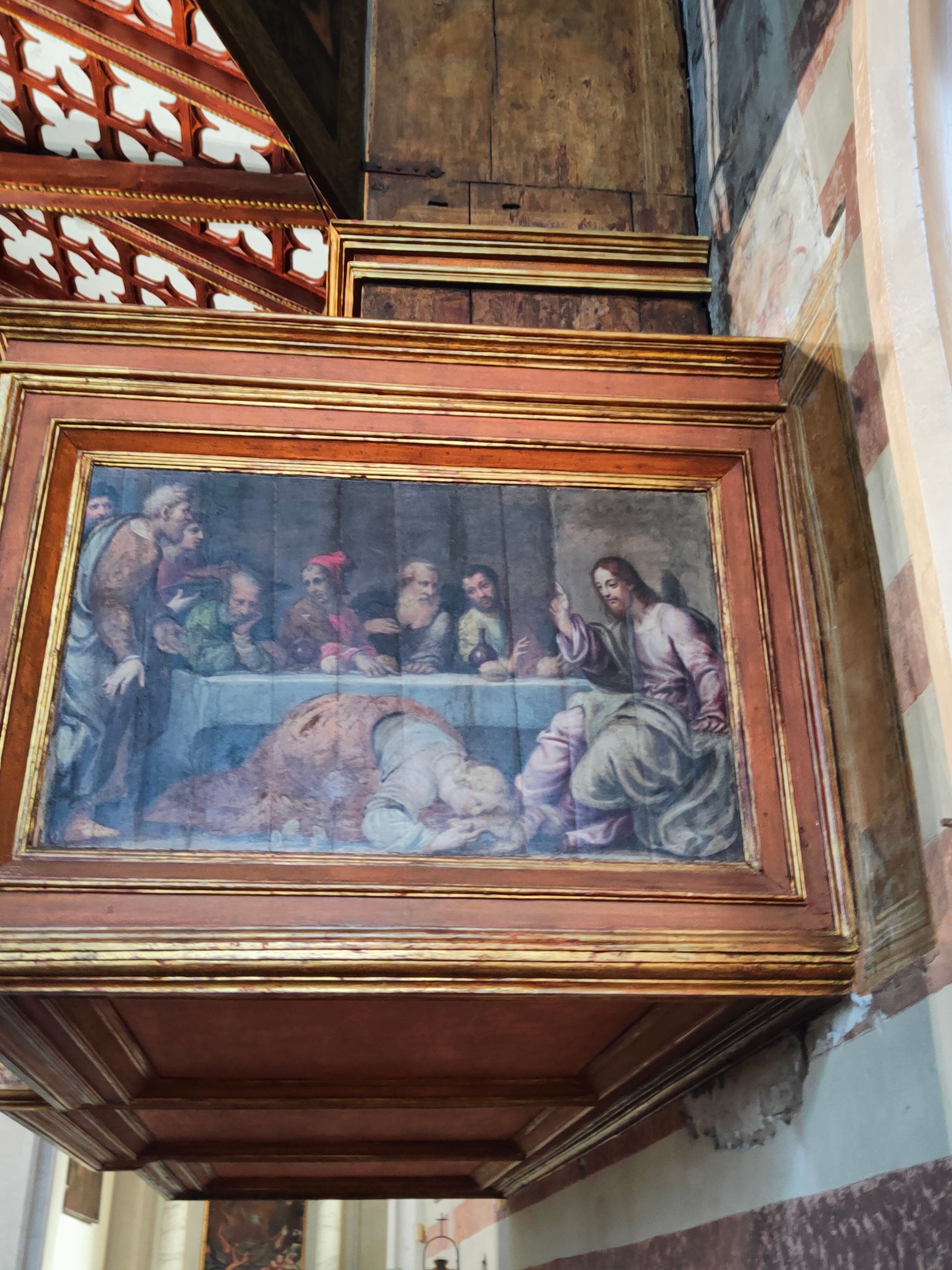 Il Crocifisso è un'importante opera d'intaglio che pur richiamando modelli artistici del 1400, viene attribuito a Pomponio Amalteo (1556).