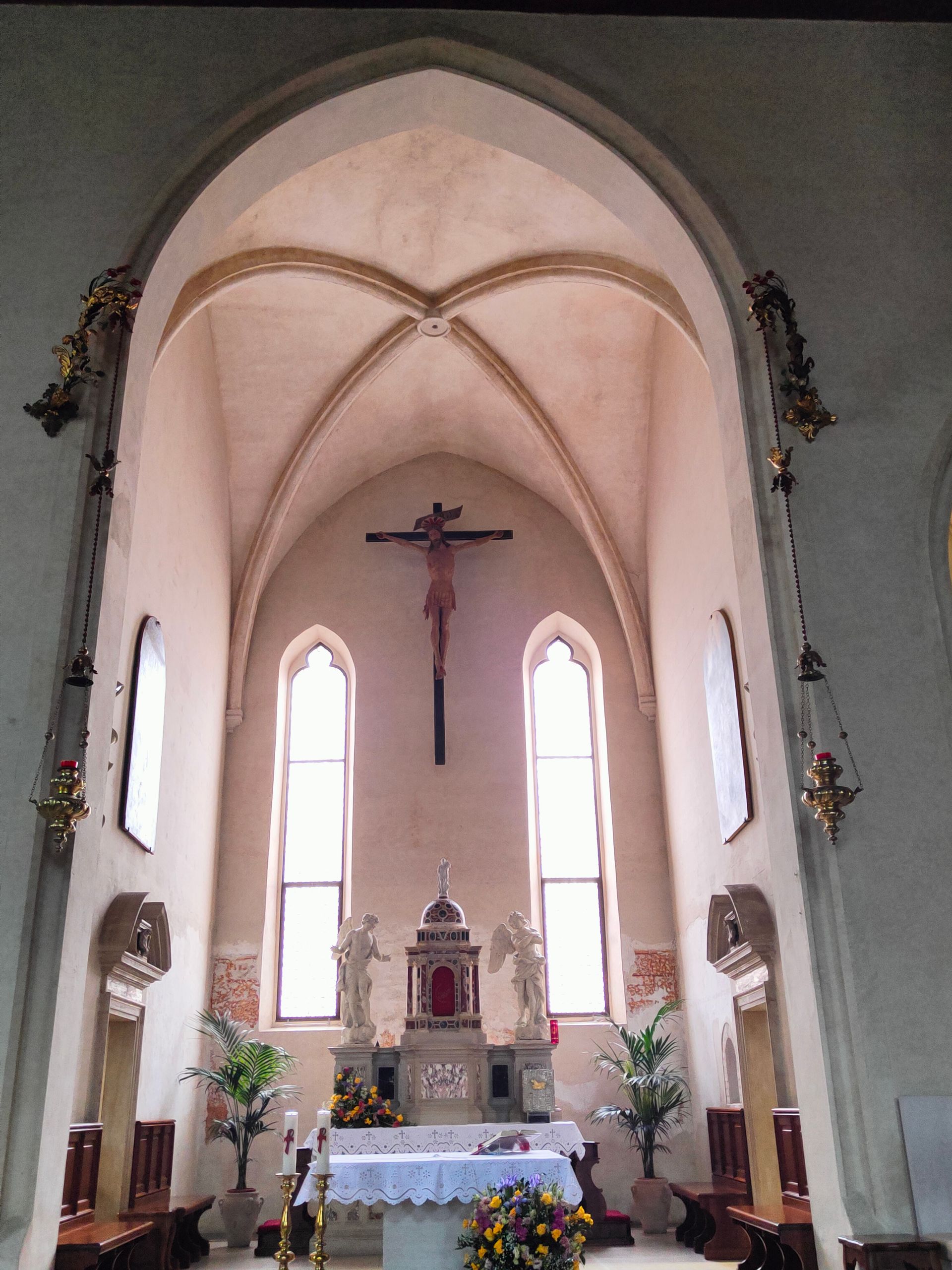 L'altare di San Nicolò (a sinistra) di stile neogotico (fine 1800), è opera dei tagliapietre Giuseppe e Daniele Ciotta di Meduno.